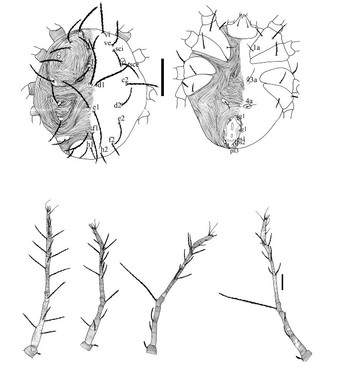 بدون موهای اسکاپیتولار؛ موهای شکمی 4a، موهای جنسی و کنارجنسی وجود نداشته؛ فاقد پای چهارم می باشد، با تعداد موهای کمتری نسبت به پوره های سن یک روی بندهای پاها می باشد.
